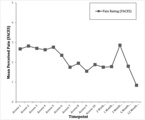 The average pain rating for each timepoint across participants was plotted to show the trajectory of perceived pain during the study (Figure 4). Overall, the trajectory displays a downward trend throughout the primary intervention. Post-intervention, there was some fluctuation in pain rating and was lowest at the 12-month follow-up (M = 1.00, SD = .97). Mean and standard deviation for pain rating at each timepoint is in Table 2.