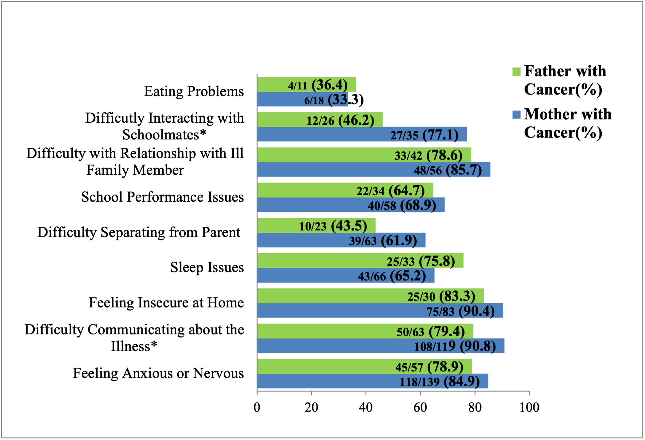 Demographic information was tabulated. The proportions of children who had parent-reported behavioral issues in nine areas prior to participation in the Wonders & Worries intervention were determined. Cross tabulations with Pearson’s Χ2 were performed to compare results of these pre-existing behavioral issues between mothers with cancer and fathers with cancer. The subsets of children who had parent-reported pre-existing behavioral issues that improved following intervention were determined. Cross tabulations with Pearson’s Χ2 were performed to compare results of improvement in behavioral issues between mothers with cancer and fathers with cancer.